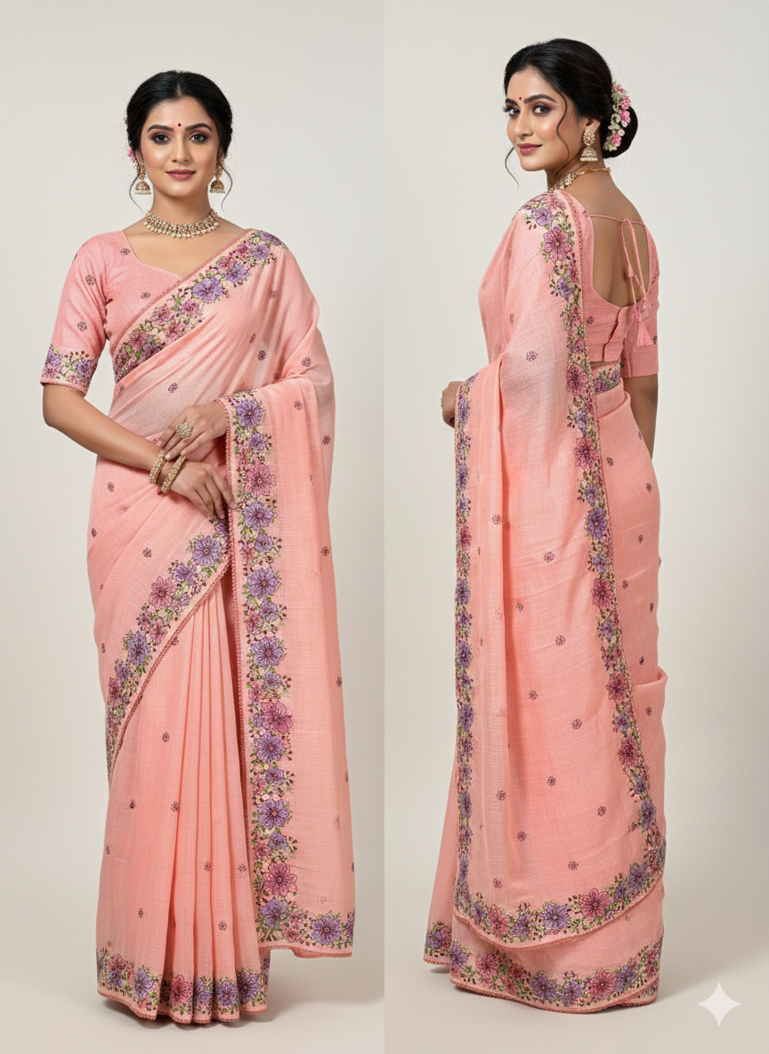 This ensemble features a lightweight, peach-colored sari crafted from a textured fabric, likely a linen or cotton blend, designed for both comfort and style. The highlight of the piece is the intricate floral embroidery in shades of lavender, purple, and magenta that runs along the borders and is scattered as delicate motifs throughout the body